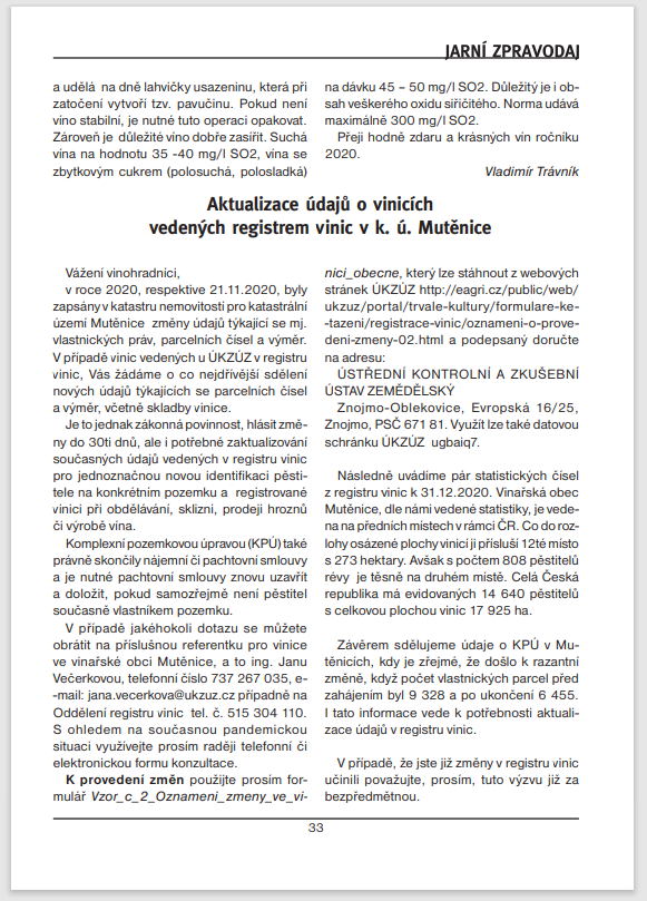 | Aktualizace údajů o vinicích vedených registrem vinic v k.ú. Mutěnice | Naše Mutěnice | 22.3.2021 | Trvalé kultury | jaro 2021 | články | 33 |